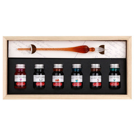Jacques Herbin stiklinio plunksnakočio-rašiklio ir rašalų rinkinys medinėje dėžutėje