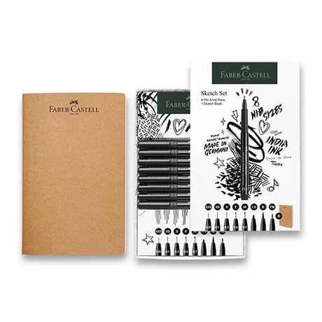 Faber-Castell Pitt Artist India Ink rašiklių piešimui rinkinys, 8 vnt. + eskizavimo bloknotas