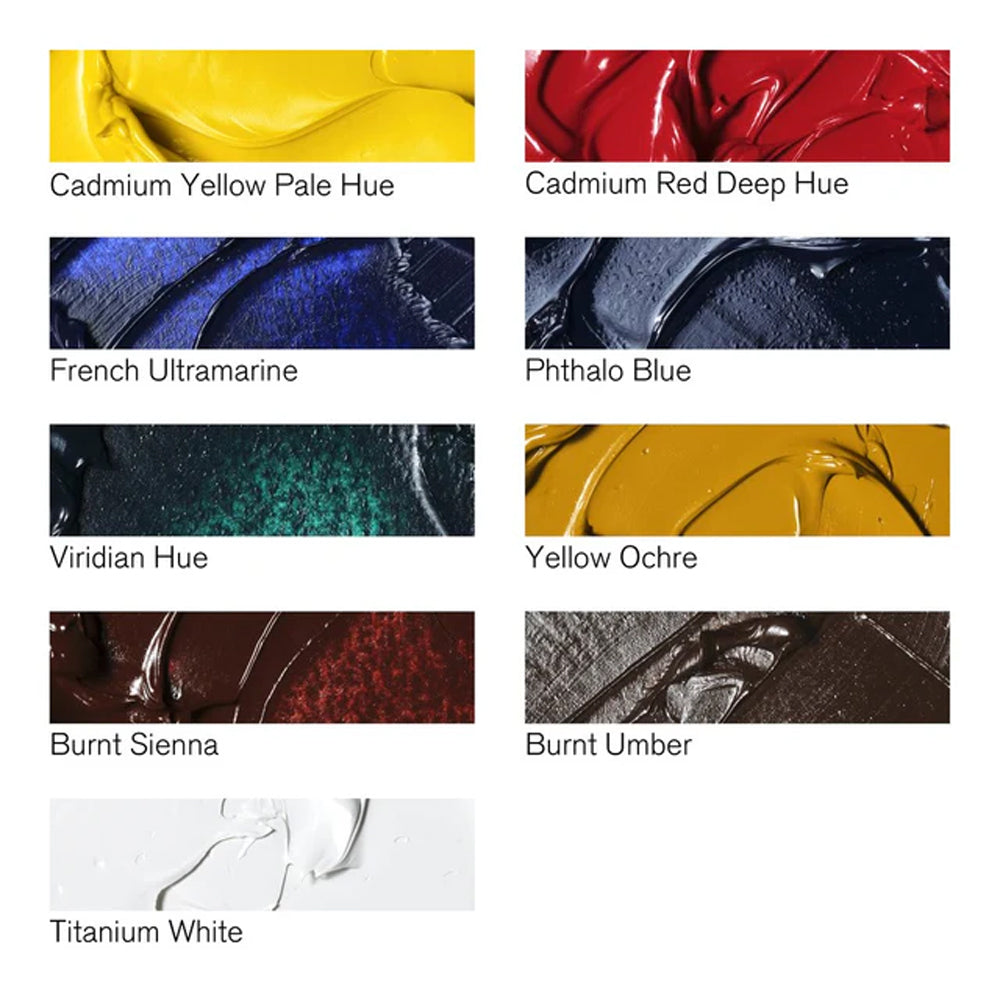 - Rinkinį sudaro: 1 x 37 ml titano baltos spalvos tūbelė, 1 x 75 ml Liquin Original tapybos mediumo buteliukas, 2 x Winton Hog natūralių šerių teptukai, 1 x instrukcija, 8 x 21 ml Winton aliejinių dažų tūbelės: Cadmium Yellow Pale Hue, Cadmium Red Deep Hue, French Ultramarine, Phthalo Blue, Viridian Hue, Yellow Ochre, Burnt Sienna, Burnt Umber.