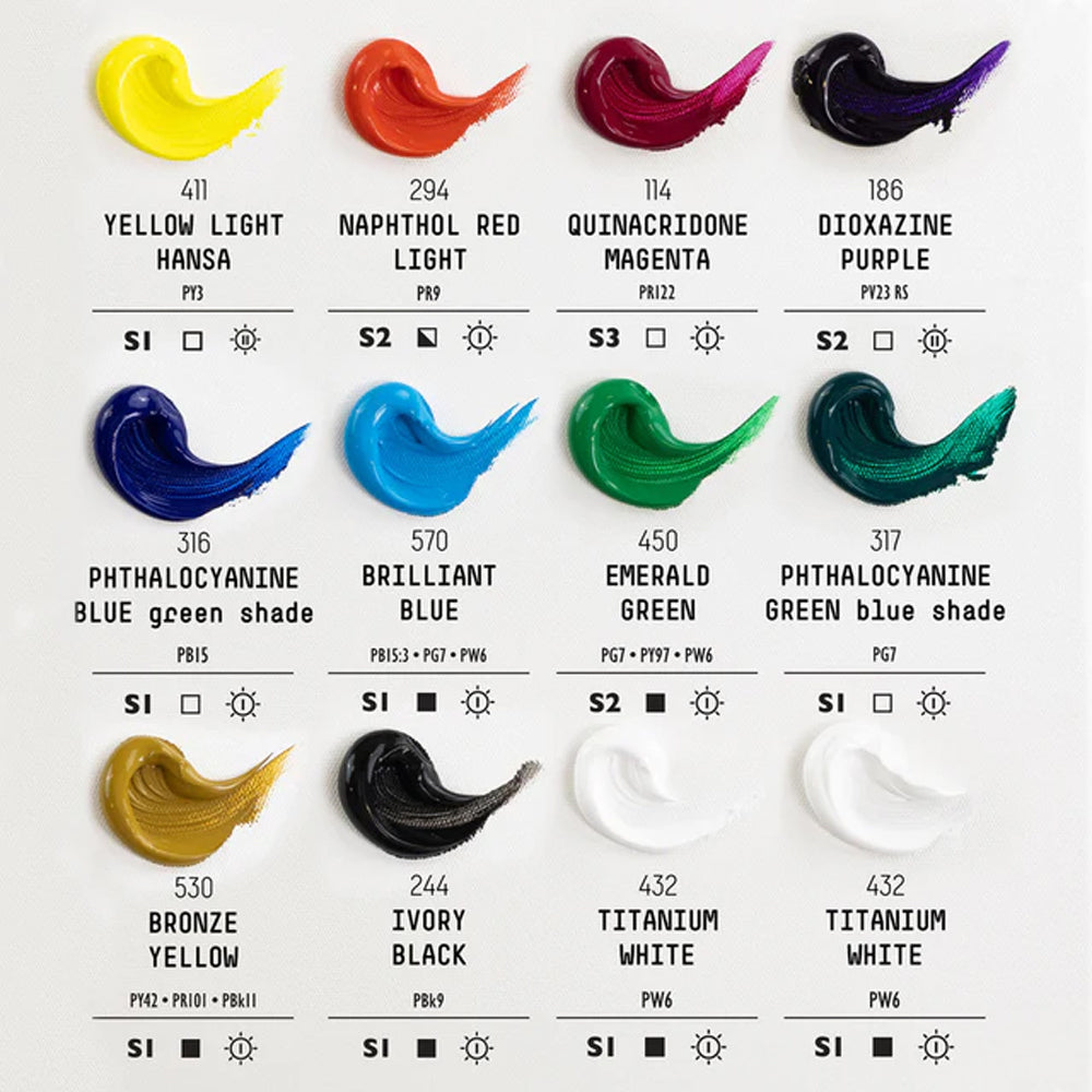 - The colours included are: Yellow Light Hansa, Naphthol Red Light, Quinacridone Magenta, Ivory Black, Emerald Green, Phthalocyanine Green Blue Shade, Phthalocyanine Blue Green Shade, Brilliant Blue, Bronze Yellow, Dioxazine Purple, 2 x Titanium White;