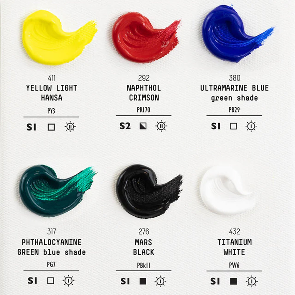 - The colours included are: Mars Black, Titanium White, Naphthol Crimson, Yellow Light Hansa, Phthalocyanine Green Blue Shade, Ultramarine Blue Green Shade;