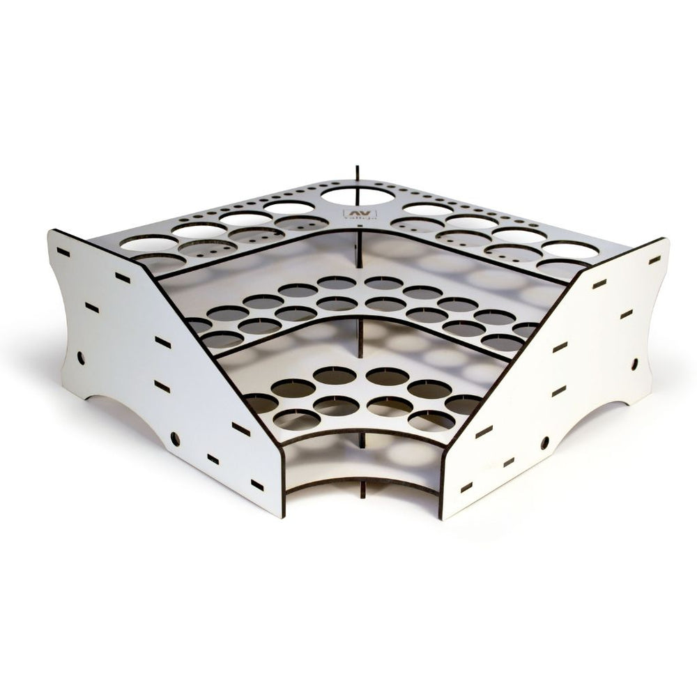 • Vallejo corner module paint stand that contains 28 paint bottle spaces of 17 ml per each, 16 of 35 ml or 60 ml, 1 of 200 ml and 26 for brushes.