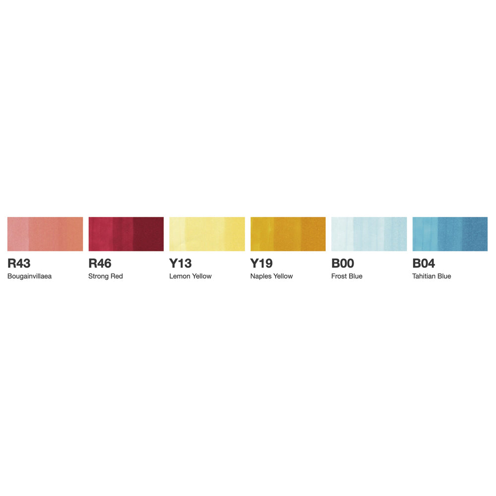 - This 6 piece set focuses on lighter-tone Primaries colours: R43, R46, Y13, Y19, B00 and B04.