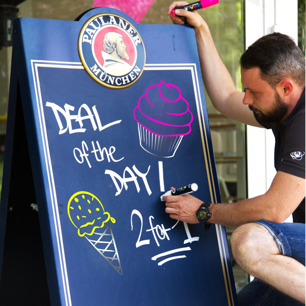 Color-intensive chalk markers, perfect for temporary applications on nearly all smooth and non-absorbent surfaces!