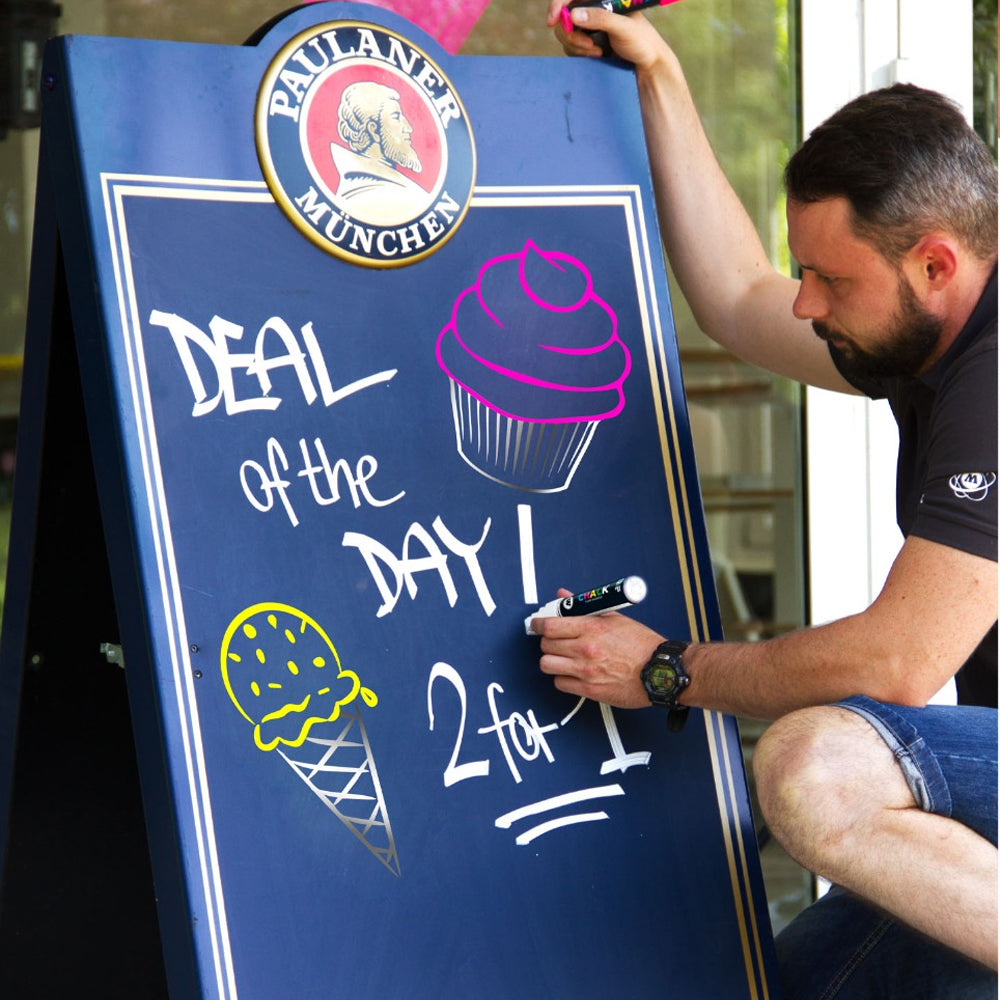 - Bright chalk markers are available in metallic colors and neon color shades which is especially a nice effect for party decorations, restaurants or gifts;