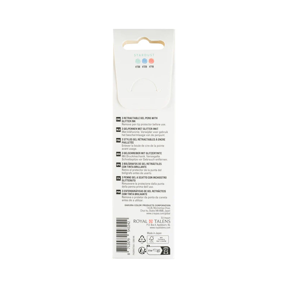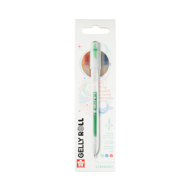 - This set consists of 3 retractable gel pens with glittering stardust red, blue and green ink;