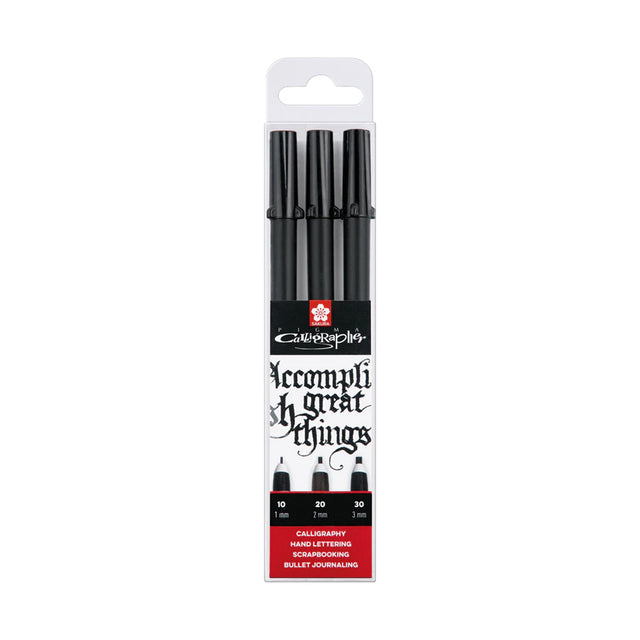 - The Pigma Calligrapher set includes 3 black Pigma Calligrapher pens with nib sizes 0.1 mm, 0.2 mm and 0.3 mm;