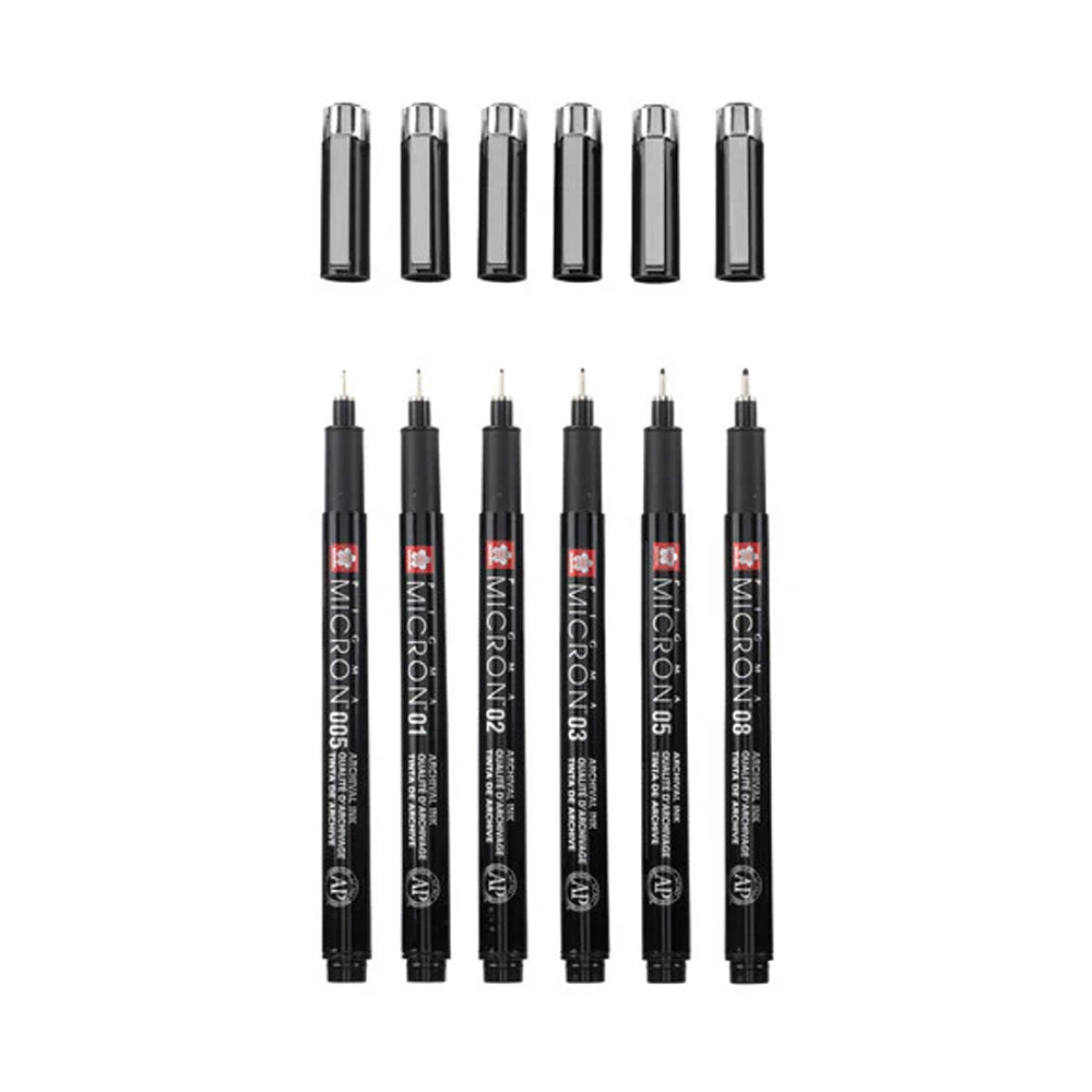 - This set contains 6 Pigma Micron fineliners in nib sizes: 1 x 005 (0.2 mm), 1 x 01 (0.25 mm), 1 x 02 (0.30 mm), 1 x 03 (0.35 mm), 1 x 05 (0.45 mm) and 1 x 08 (0.50 mm);
