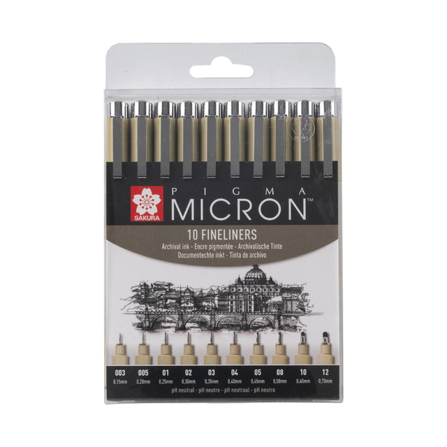 - Selection of 10 Black Pigma Micron pens with all available nib widths of this assortment: 1 x 003 (0.15 mm), 1 x 005 (0.2 mm), 1 x 01 (0.25 mm), 1 x 02 (0.30 mm), 1 x 03 (0.35 mm), 1 x 04 (0.40 mm) 1 x 05 (0.45 mm), 1 x 08 (0.50 mm), 1 x 10 (0.60 mm), 1x 12 (0.70 mm);