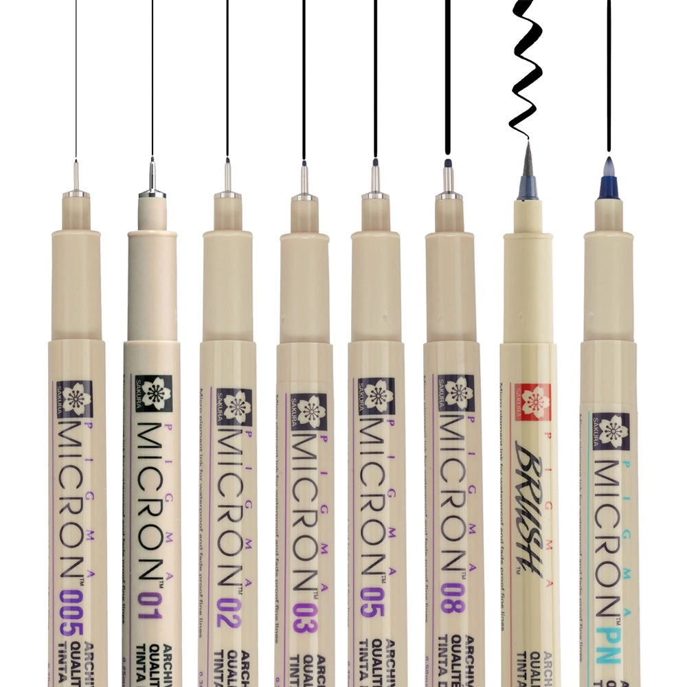 - Contents: 6 Pigma Micron pens: 1 x 005, 1 x 01, 1 x 02, 1 x 03, 1 x 05, 1 x 08, 1 x Pigma Brush pen and 1 x Pigma Micron PN for free;