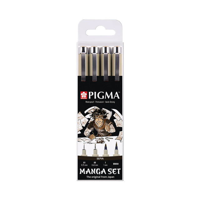 - Selection of 4 of the Sepia Pigma Micron pens, especially selected for Manga drawings: 2 Pigma Micron pens sepia (nr. 01 and 05), 1 Pigma Graphic pen sepia (nr 1.0) and 1 Pigma Brush sepia;