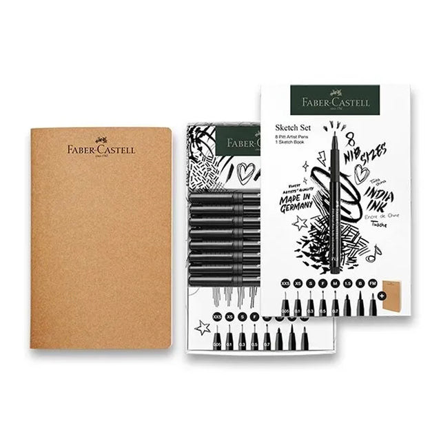 Faber-Castell Pitt Artist India Ink Pen Fineliners Set, 8 pcs. + Sketchbook is backordered and will ship as soon as it is back in stock.
