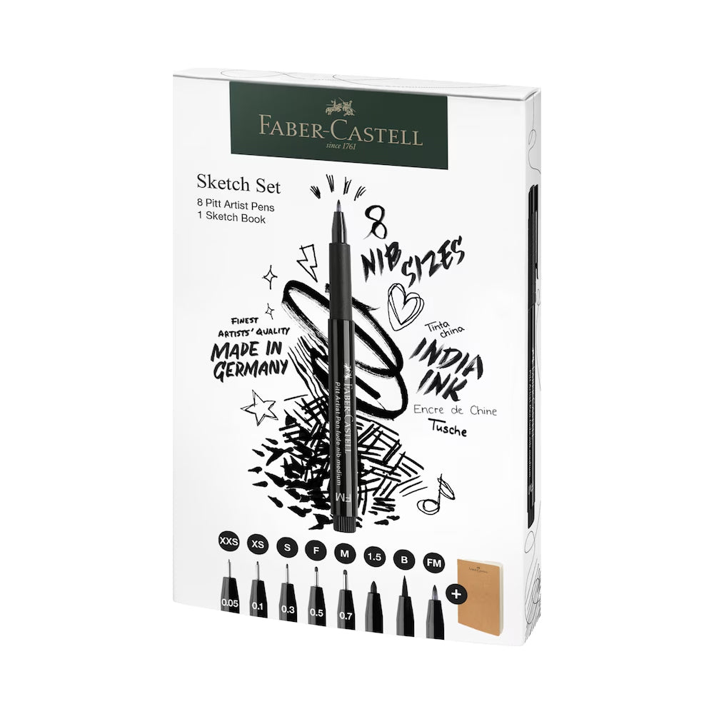 Faber-Castell Pitt Artist India Ink Pen Fineliners Set, 8 pcs. + Sketchbook