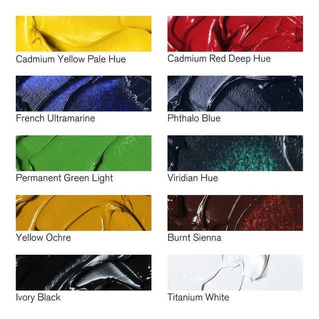 - This set contains: Titanium White, Ivory Black, Burnt Sienna, Yellow Ochre,Viridian Hue, Permanent green light, Phthalo Blue, French Ultramarine,Cadmium Red Deep Hue, Cadmium Yellow Pale Hue;