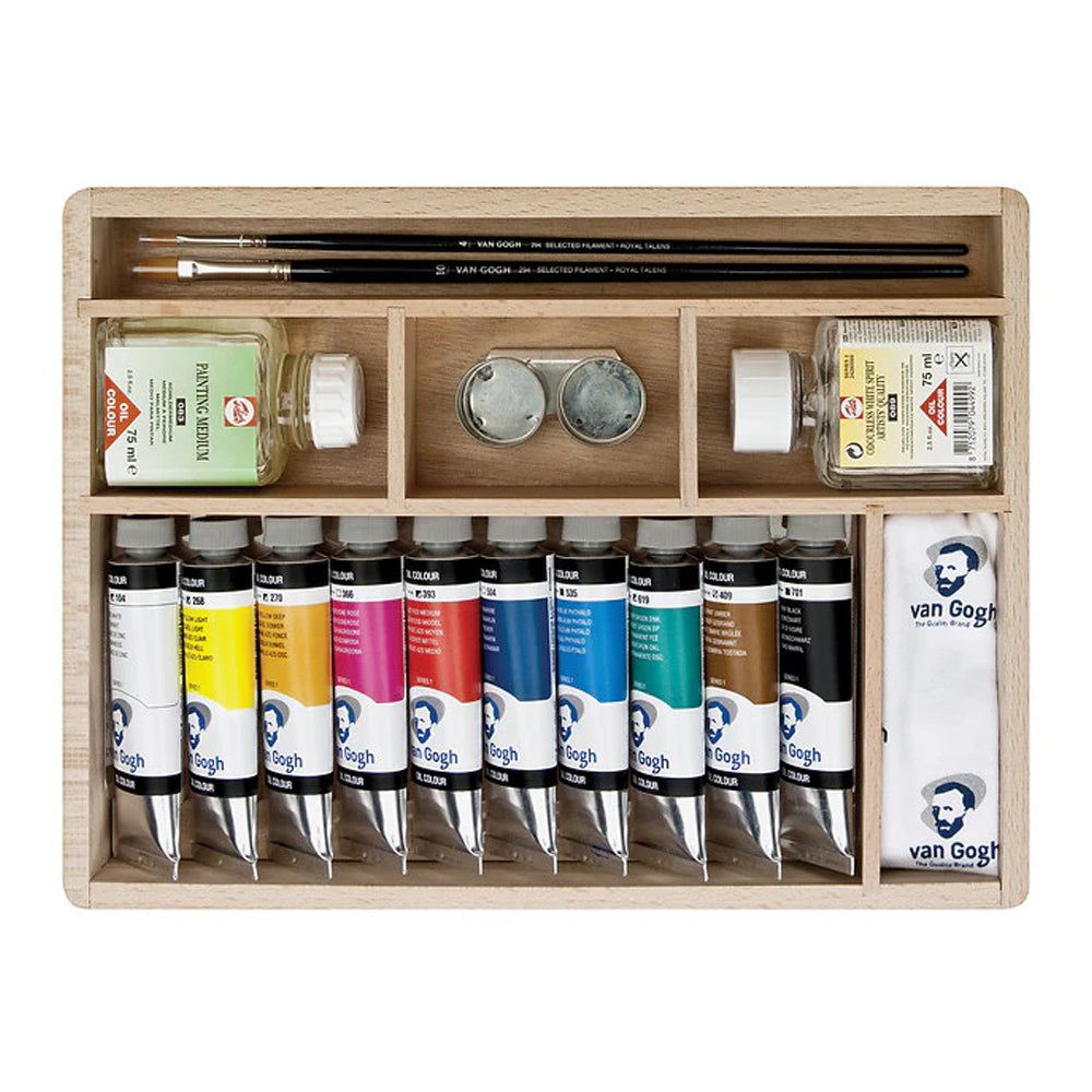 - This general colour selection basic wooden box set includes 10x40 ml Van Gogh oil paint tubes, Talens 75ml odorless white spirit, Talens 75 ml painting medium, a flat synthetic hair artist paint artist paint brush (size 10), a round synthetic hair artist paint artist paint brush (size 6), a double palette cup, a wooden palette,